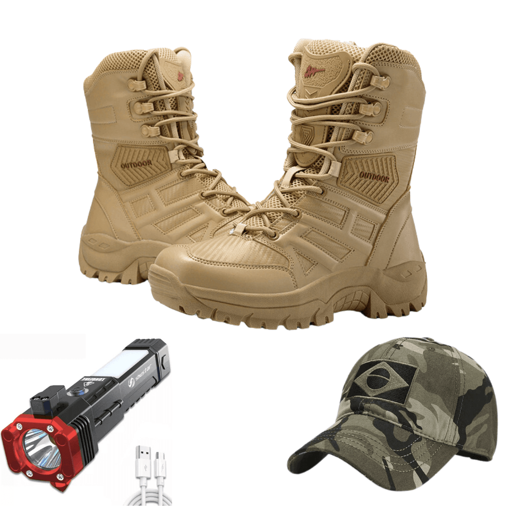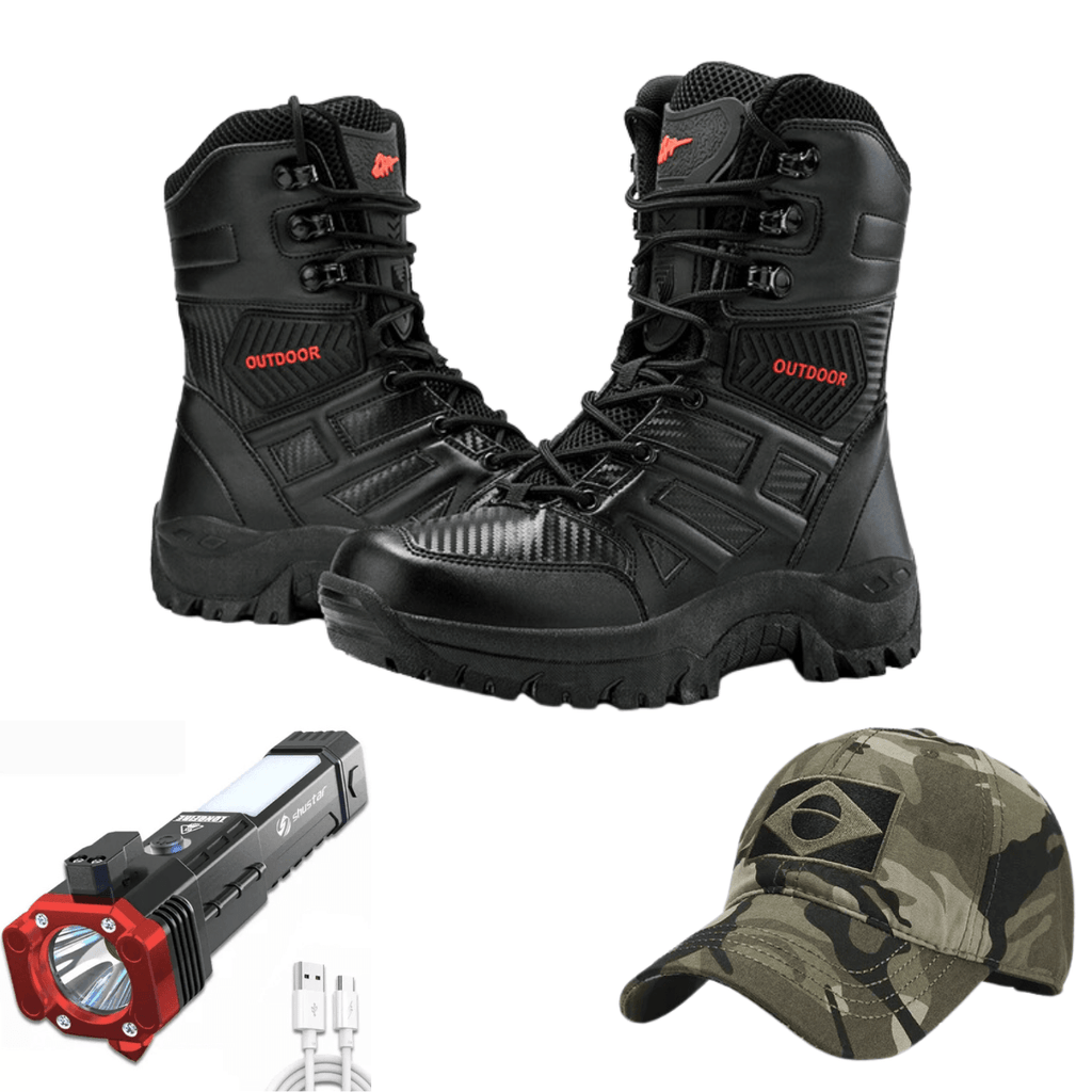 Compre o Coturno Tático Ultra Resistente e ganhe um Boné Camuflado + Nossa Lanterna Indestrutível 4 em 1
