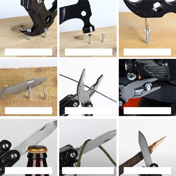 Com funcionalidades que incluem martelo, alicate, faca, serra, chave de fenda, abridor de garrafas, abridor de latas, você estará sempre preparado para qualquer desafio. Uma verdadeira central de ferramentas na palma da sua mão.